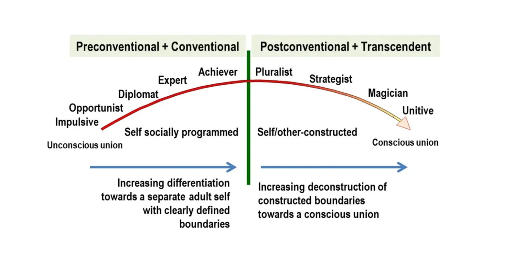 Cook-Greuter's developmental framework shows a fascinating arc: development begins from "unconscious union" and moves through increasing differentiation toward a separate adult self with clearly defined boundaries (pre-conventional through conventional approaches), then continues through post-conventional and transcendent approaches where constructed boundaries begin to deconstruct toward "conscious union." This isn't a simple linear progression—it's more like a spiral that moves from embedded wholeness, through separation and individuation, back toward integrated wholeness.